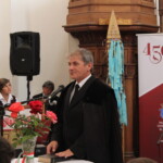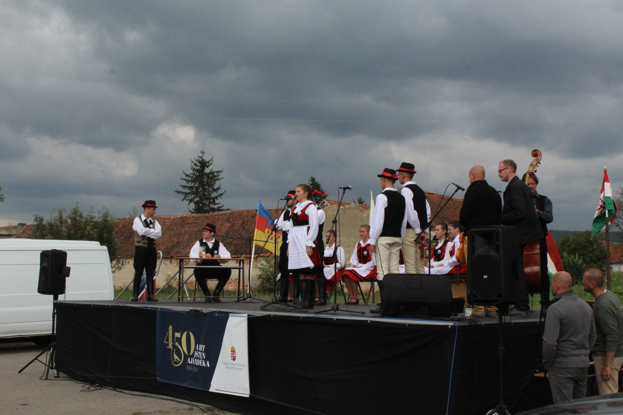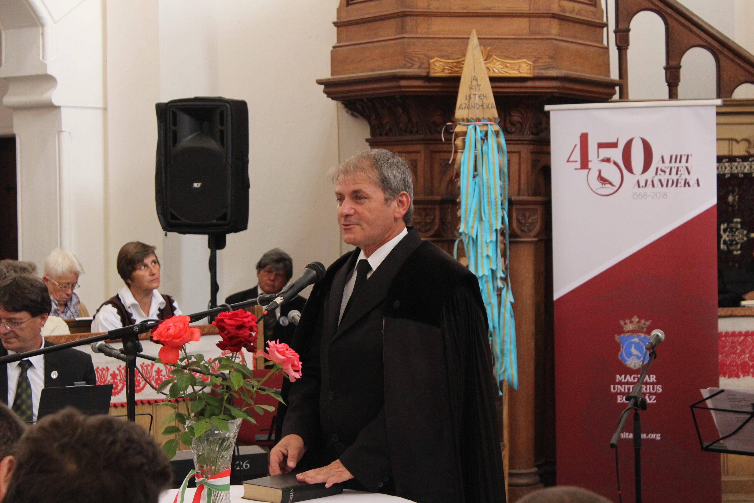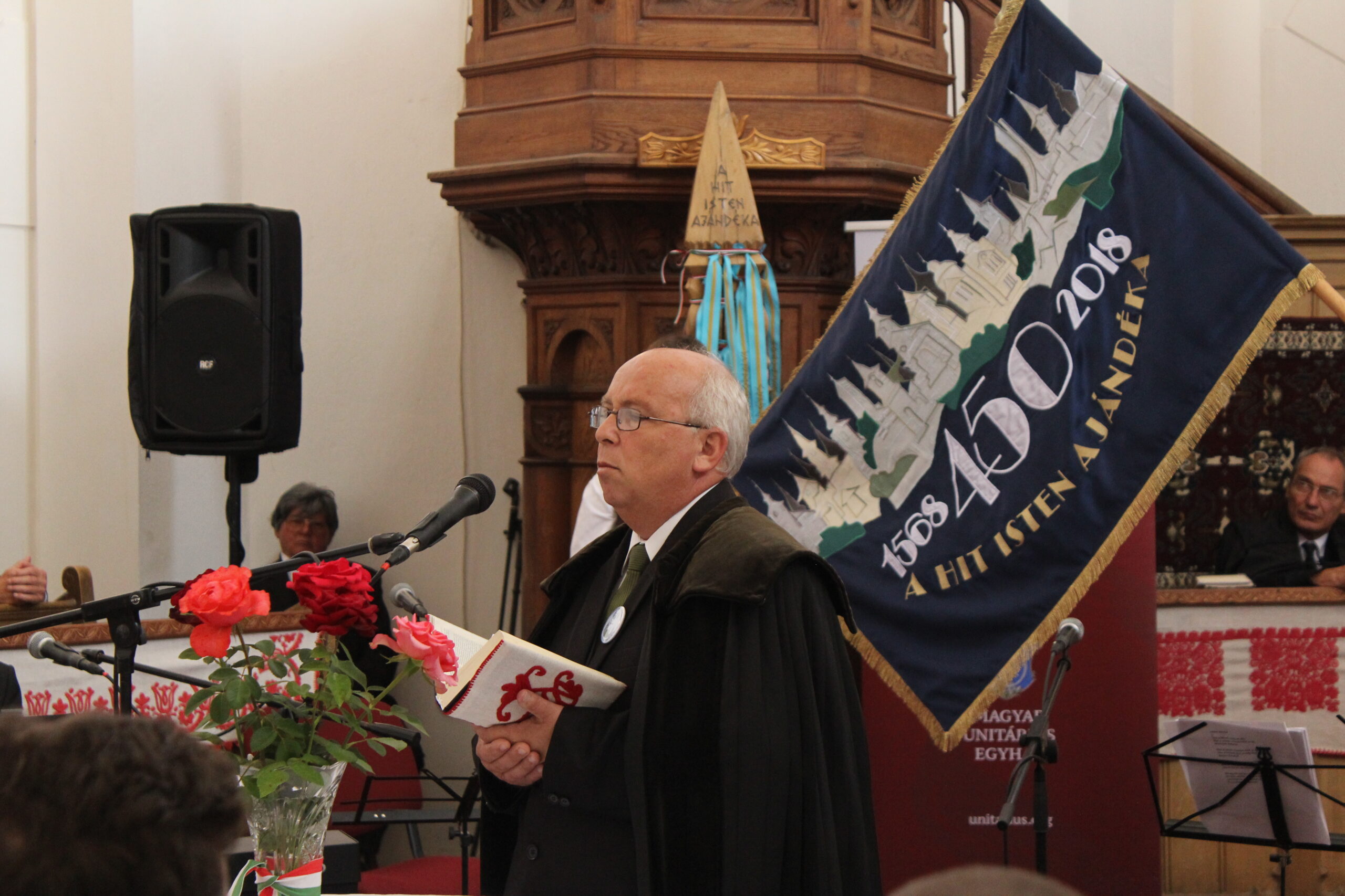 Az elhangzottakhoz simult hangulatban, mélyen emberi és vallásos érzéseket váltott ki lelkivilágunkban a Dr. Czire Szabolcs teológiai tanár felvezette Daltutajok együttes koncertje, akik hangszereikkel és dalba foglalt énekeikkel mai témákkal hoztak közelbe Istenhez és megszólított minket padban ülő gyermekeit. A Pákéi Pakey Lajos tervezte monumentális templombelső hangulatát ugyancsak emelő fából való művészi alkotások hangulatába illeszkedett be az az emlék-kopja, amelynek jelképvilágát Balázs Antal nyugalmazott sepsiszentgyörgyi néptanító és faragómester alakította-magyarázta és amelyen A hit Isten ajándéka unitárius jelmondat, valamint az 1568-2018 történelmi évszámok láthatók. Ifj. Kozma Albert helybeli unitárius lelkész kérésünkre elmondta, hogy a kopjafát egy olyan méretes, száraz, ép és kemény tölgyfából faragta ki mestere, amelyet a XVII század elején, az 1617-ben épült bölöni templomvár keleti bástyájában találtak meg évekkel ezelőtt, s ami minden bizonnyal a vár belső védő-járatának egyik tartógerendája lehetett, s így közel egyidős azzal az évfordulóval, amit éppen most ünnepelünk. Avatóbeszédet mondott Palkó Zalán Koppány felsőrákosi gyakorló segédlelkész. Székely zászló színeit viselő szalagokat helyeztek el az együvé tartozás jegyében a kopján az egyházközségek lelkészei és átvették a tordai országgyűlés kiáltványát tartalmazó emléklapot Buzogány Dezső kalligrafikus alkotását. Felavatták a találkozó tiszteletére készült díszes egyházköri zászlót, amelyen az unitárius címer és az említett jelmondat olvasható. Avatóbeszédet mondott és megáldotta Nt. Török István egyházköri esperes (képünk). Erdély vallástörténetének kiemelkedő alakja volt a mártír egyház-alapító Dávid Ferenc és az általa útjára indított erdélyi magyar unitárius egyház- emelte ki köszöntő beszédében a bölöni ünnepséget jelenlétével megtisztelő Soós Zoltán Magyarország Csíkszeredai Főkonzulátusának konzulja. Köszöntőt mondott Boros János a Magyar Unitárius Egyház főgondnoka, Demeter Zoltán egyházköri felügyelőgondnok, Fülöp László a szomszéd miklósvári római katolikus és Simon László apácai evangélikus lelkészek. Népi és vallásos ihletésű műsort mutatott be a nagyajtai Áfonya citerazenekar. A kultúrotthon udvarán fellépett a bölöni Kék Virág és a sepsiszentgyörgyi Zöld Fenyő néptánccsoport. Az ünnepi találkozó terített asztal mellett zárult.